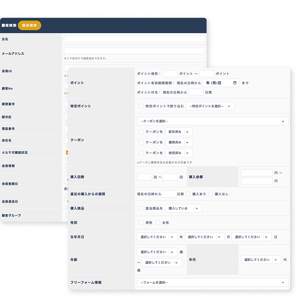都道府県、性別、年代、誕生日だけでなく、購入商品や購入回数、さらに直近の購入からの期間、ポイントの保有など様々な絞込でより柔軟なリピート顧客を獲得できます。