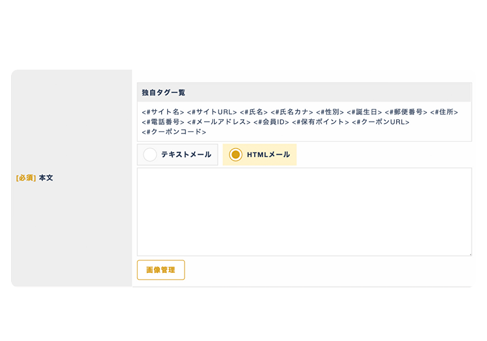 スタンダードなテキストメール以外にもHTMLを活用した表現力豊かなメールも送信することが可能です。