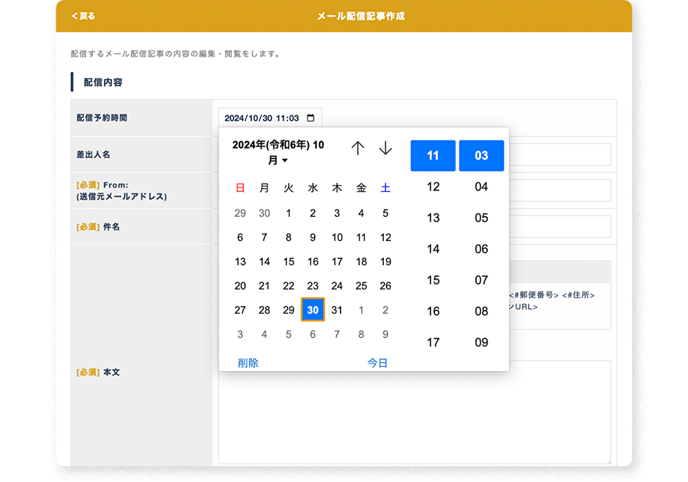メルマガは日時を指定して、予約配信が可能。aishipの管理画面から、配信予約時間を設定するだけ。