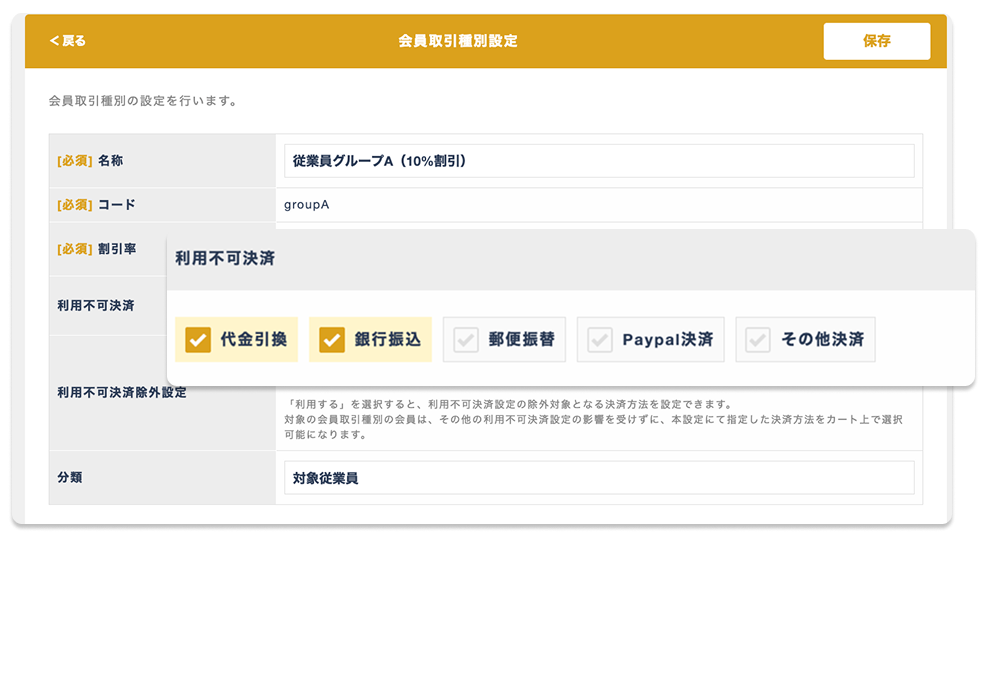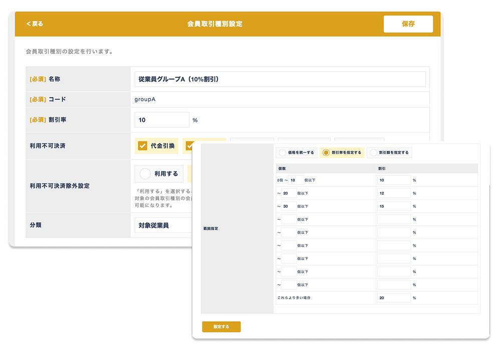 法人向けの掛け率設定、従業員向けの社割価格、VIP顧客限定の特別決済方法など、