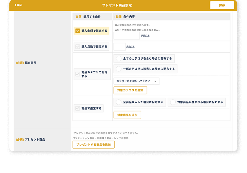 購入に合わせてプレゼントする商品の配布条件(購入金額や対象カテゴリなど)を細かく設定。