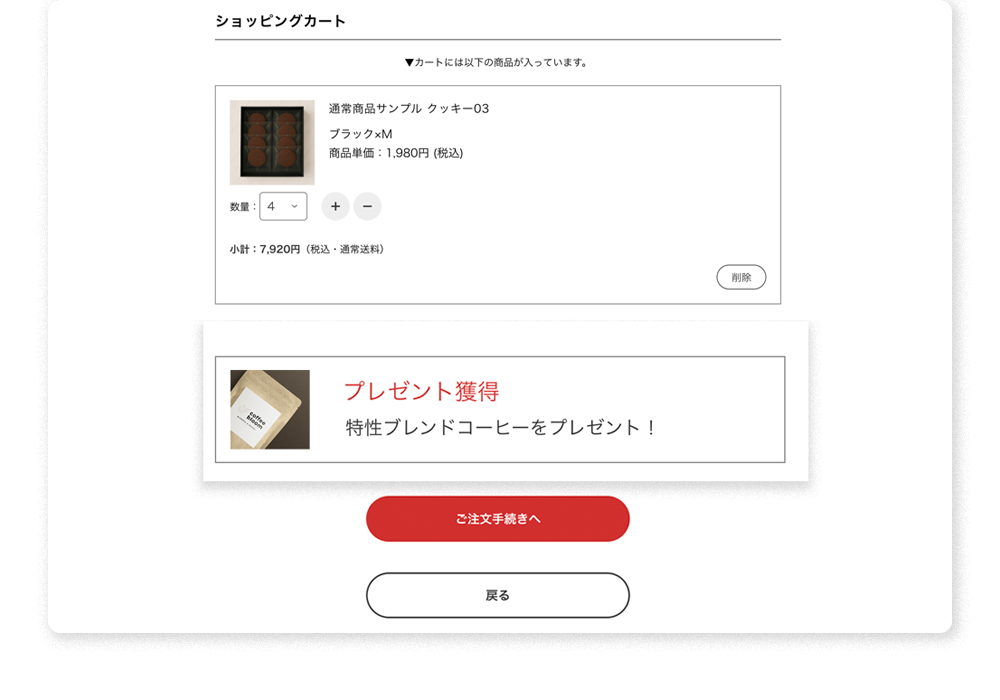プレゼント獲得条件の達成状況をカートページや注文確認画面でリアルタイムに表示でき、ユーザーに分かりやすく伝えることが可能です。