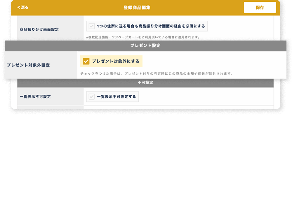 商品ごとに「プレゼント対象外設定」が可能です。