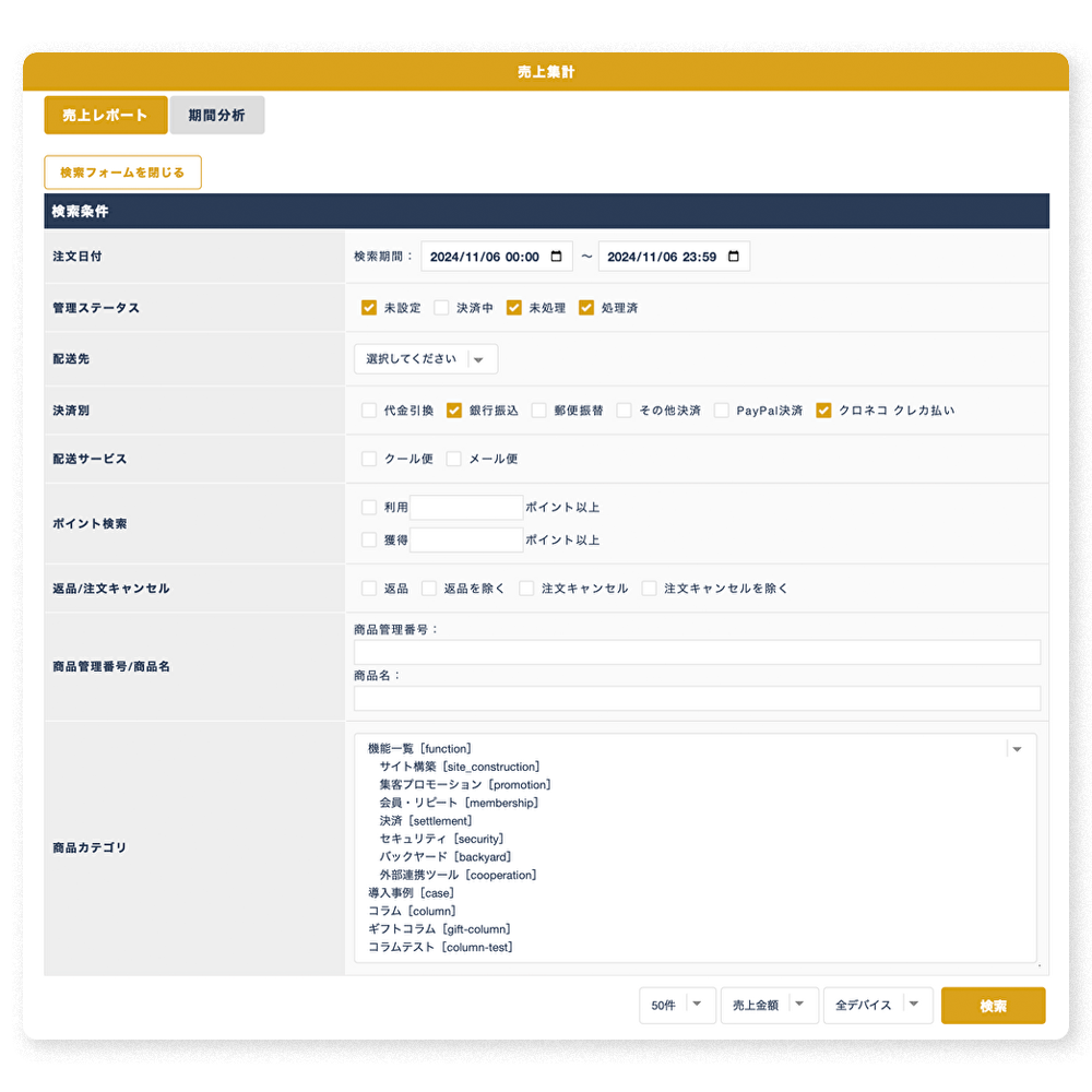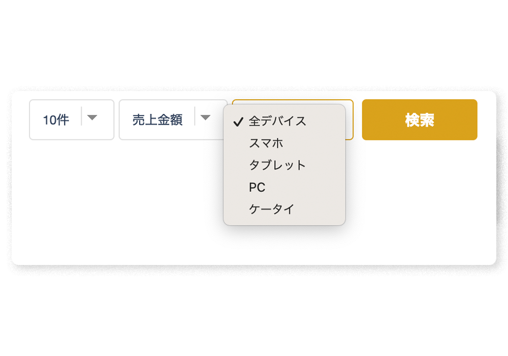 期間別にソートをして「デバイス毎」や「個別商品」、「カテゴリ毎」「決済別」などショップオーナーのニーズに沿った個別の確認に対応。