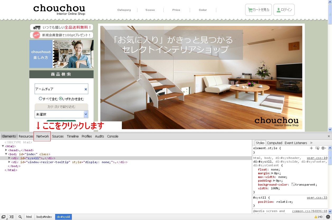 最初は「Elements」が表示されますが、ここの「Network」をクリックします。クリック後は何も表示されてないかと思いますがサイトを更新します(「F5」を押してください)。