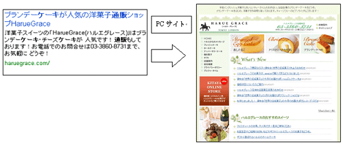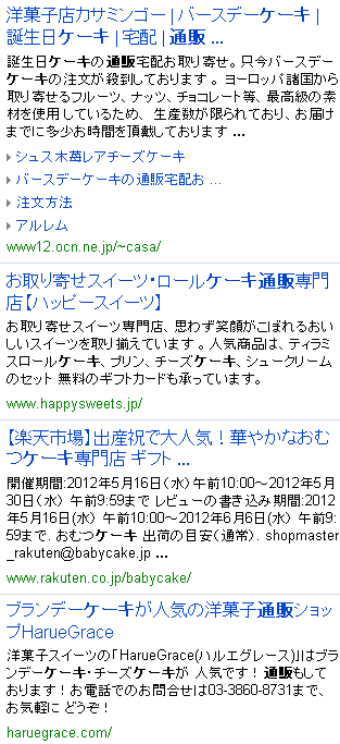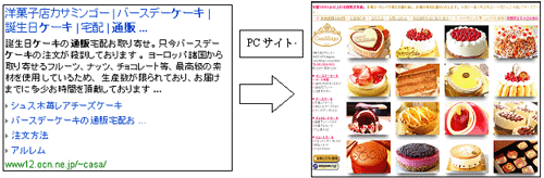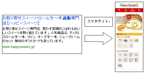 下記は、スマートフォン端末にて「ケーキ 通販」で検索した場合の一例です。これを見ただけで、どのサイトがスマートフォンに対応したサイトであるか、判別できますでしょうか?