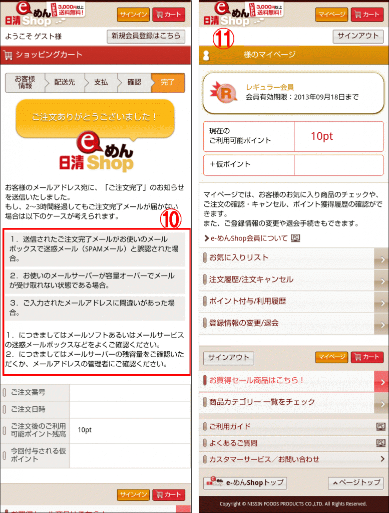 ⑩注文完了時のページです。「注文確認メールが到着しない」といった内容は、よくあるお問い合わせの1つとなりますが、ご注文完了メールが届かない要因をこのように明記しておくことで、ショップへのお問い合わせが軽減されるだけでなく、購入者様に対しても不信感を抱かせずに済み、安心して買い物を終了して頂けます。